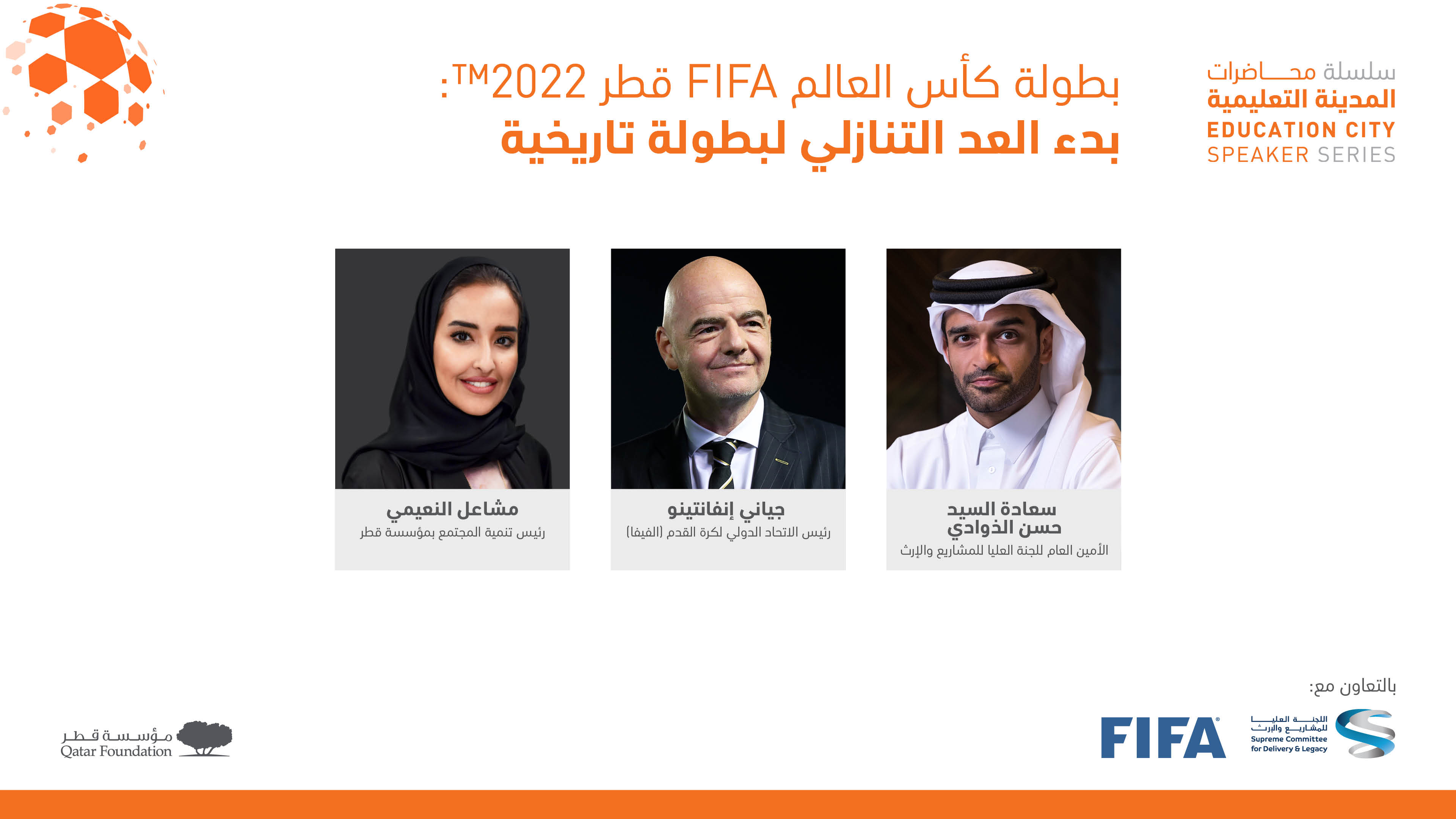 انضموا إلينا في حلقة نقاشية خاصة من سلسلة محاضرات المدينة التعليمية تستضيف عددًا من الشخصيات البارزة بالتعاون مع اللجنة العليا للمشاريع والإرث والاتحاد الدولي لكرة القدم (الفيفا)، احتفالًا ببدء العد التنازلي لعام واحد يفصلنا عن انطلاق بطولة كأس العالم FIFA قطر 2022™.
